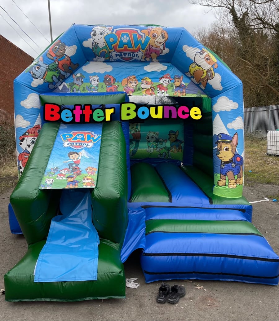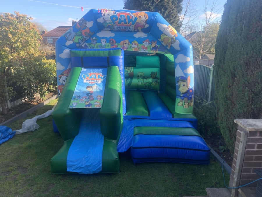 Our 12ft x 17ft Paw Patrol castle has a slide attached to the front of the bed giving it double the fun so your little paw patrol fans can slide and bounce at the same time! This castle features the whole Paw Patrol gang led by the leader Ryder! You will be sure to see Chase, Marshall, Skye, Rocky and Zuma on this castle