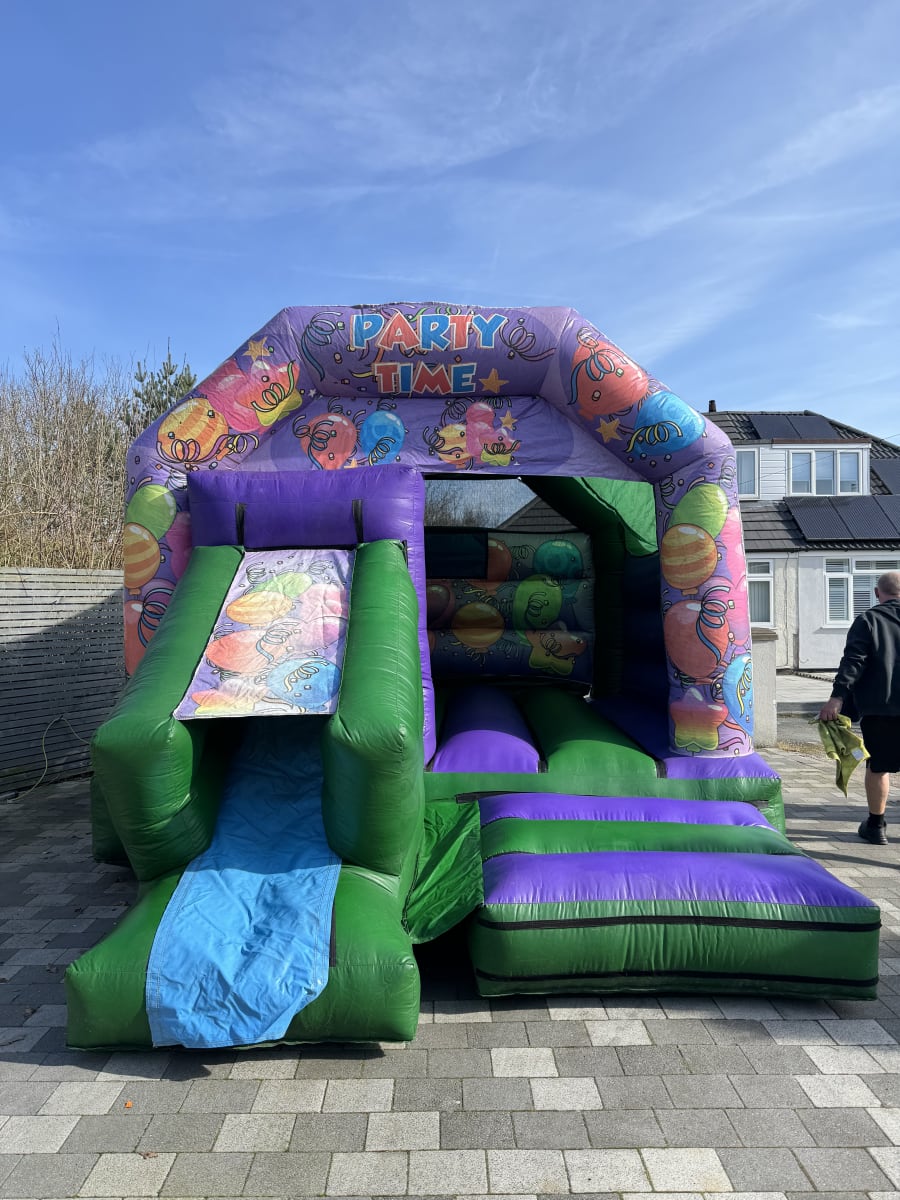 Here we have our 12ft x 17ft purple and green party time slide. We can guarantee you that it is sure to get the party started for everyone as it is a great neutral castle for both boys and girls. This castle can also be fitted with disco lights for an extra cost of £15, please make sure you add this to the bottom of your notes at the end of your booking form.